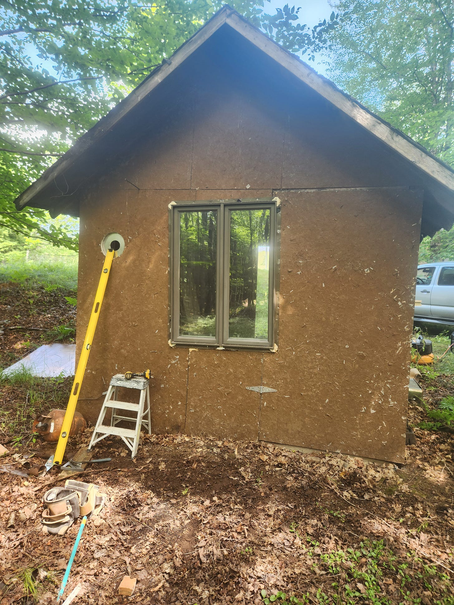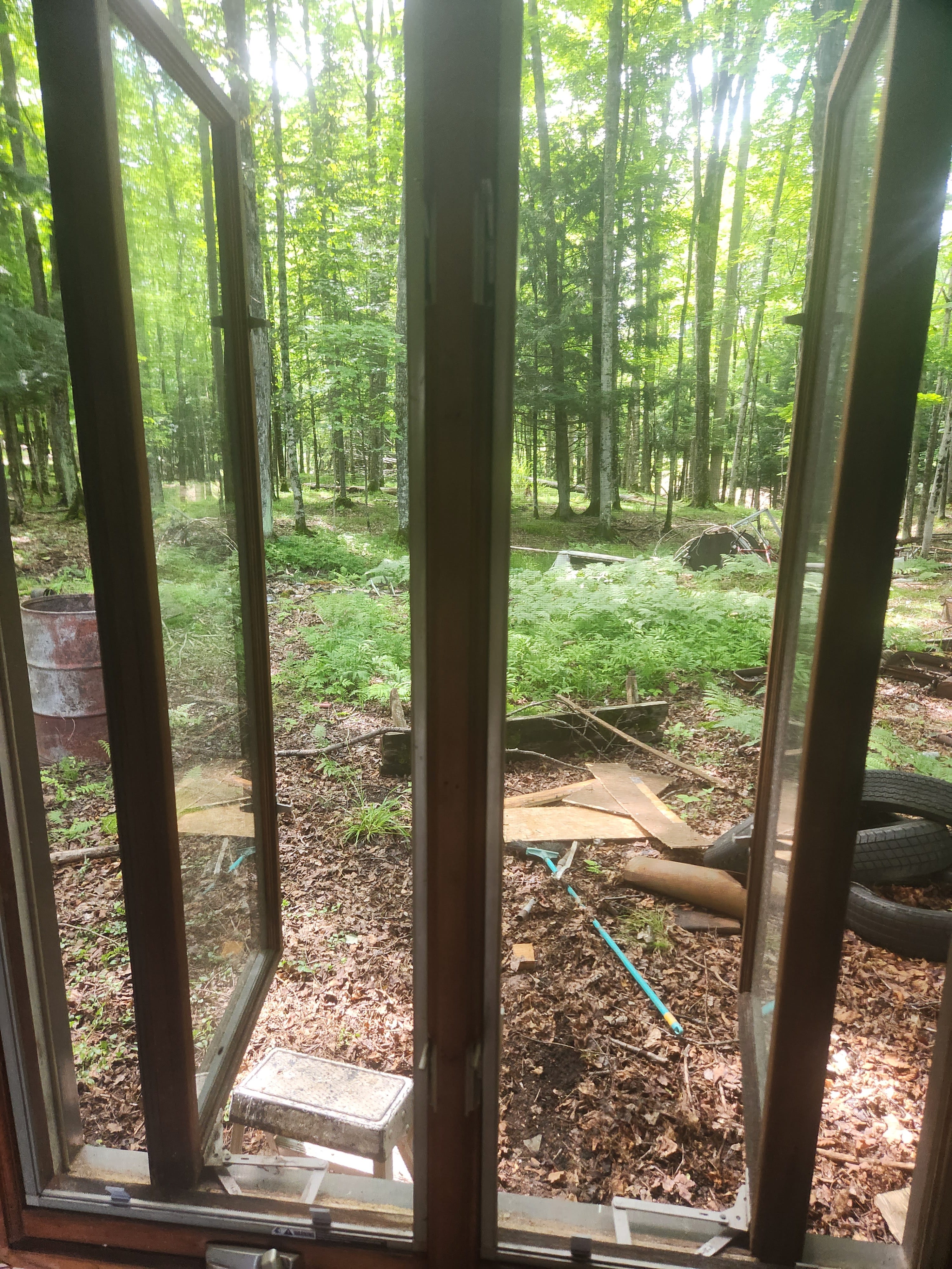 I did install the overhead lights with some blatant solitary cursing as the mobile home ceilings sag even if roofed over and are made of this composite shitty cardboardy crap which isn’t worth hassle or cost of time to replace with sheetrock so i live with it, embrace it. Also up in Houghton doing the weekly Wal-Mart food shop hit the re-store there for a $60 window to bring more light into the outbuilding where i have slated a used full mattress for company, if they dare…. And it did. A great view behind to forest as well: