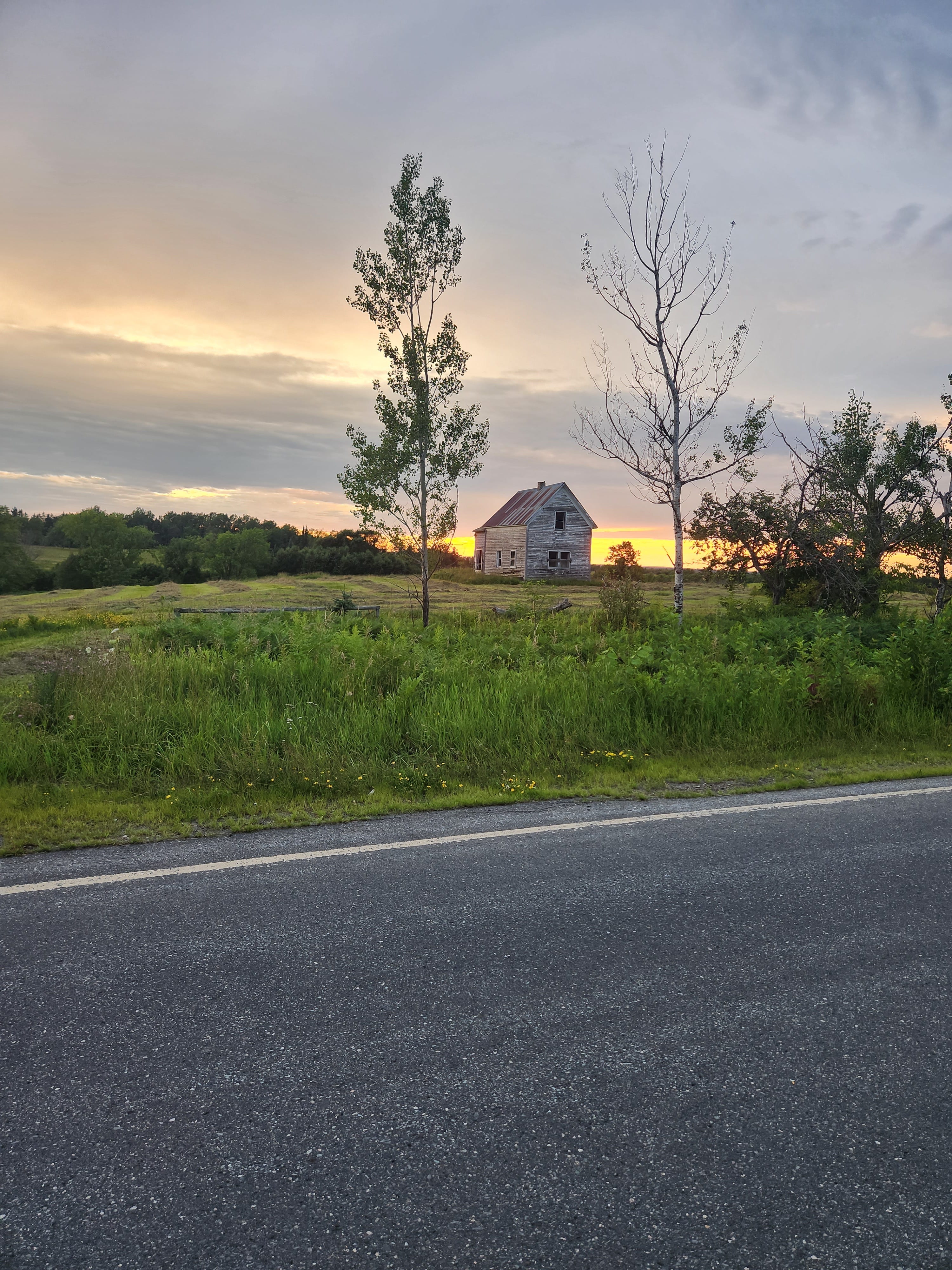 And now it has. The rain had put the trout down, no doubt engorged with the wash of worms and terrestrials and the evening became a meditative one on the water, sometimes casting is like that, not a thought in one’s head, the waders and legs finding grip in the more hardened middle of slow moving river. Indeed when i first scrambled in a little ahead of that stick and overcome with deferred lust tangled foot in alder root as i fought the damned quicksand as i had the first time i fell straight into the water and rushed back onto the bank cursing in a panic while heavinf =g phone into grass tom dry it. Later casting with looping unrushed focus the firm footing felt good and even later driving home thru the Baraga Plains towards my new home and truly mine now in so many ways i enjoyed even the annoying wet cling of soaked jeans on thighs and the tangerine sky whether it was caused by the smoke from distant Cree lands or not. I stopped and snapped an image so i wouldn’t forget and then….continued on.