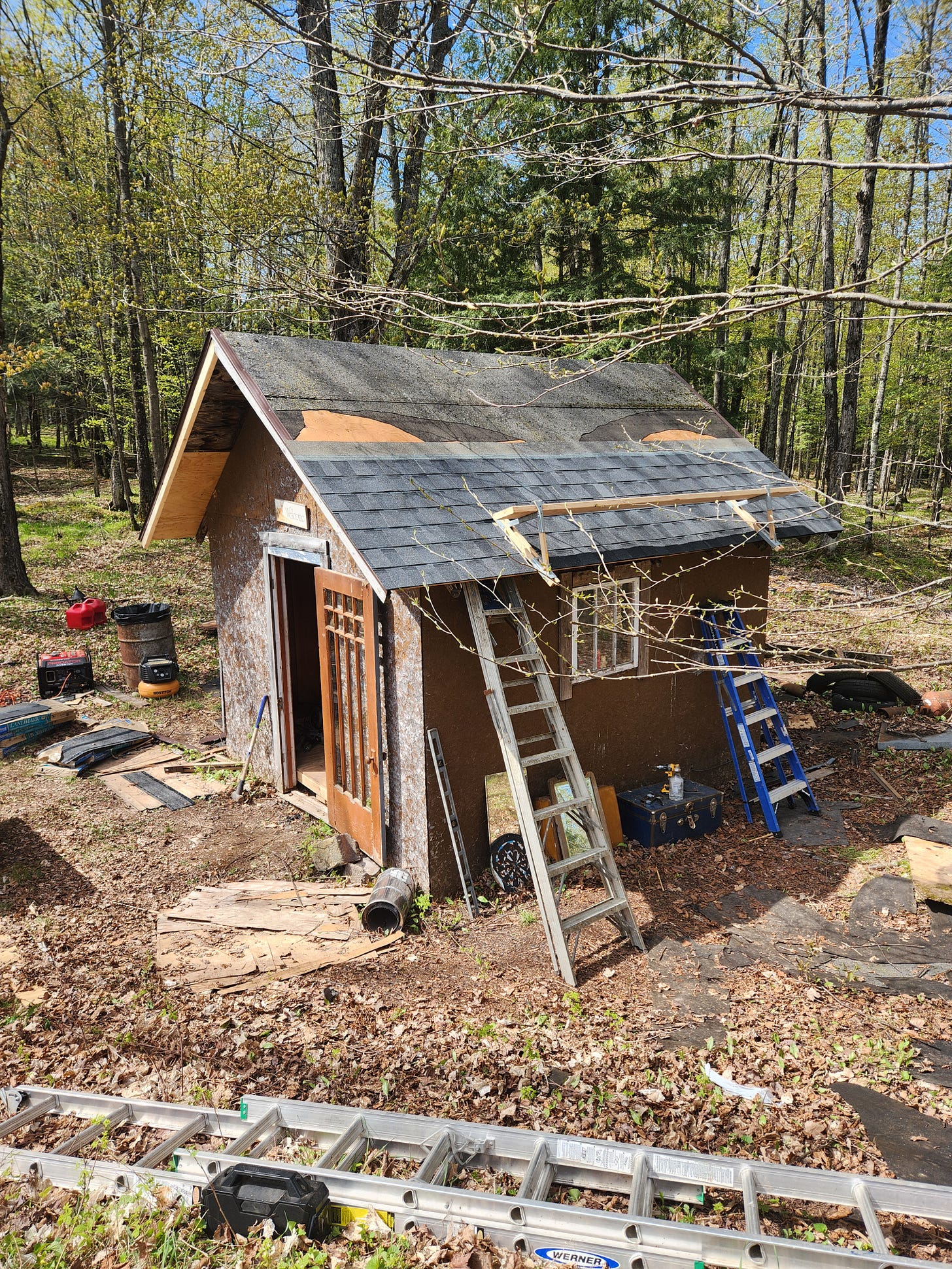 Then next day i started into the projects here which are undertaken unlike the writing with a certain procedural authority which is allows for creativity while more sure of steps along the way and less anxiety about deadlines and the winnowing away of bodily functions one paper cut at a time. The old cabin i’d cleaned out last year and put the new floor in and the casement screened habitat windows needed some roof repairs. I have been on it and the dogs lay in the sun patient, fore-bearing, hopeful.