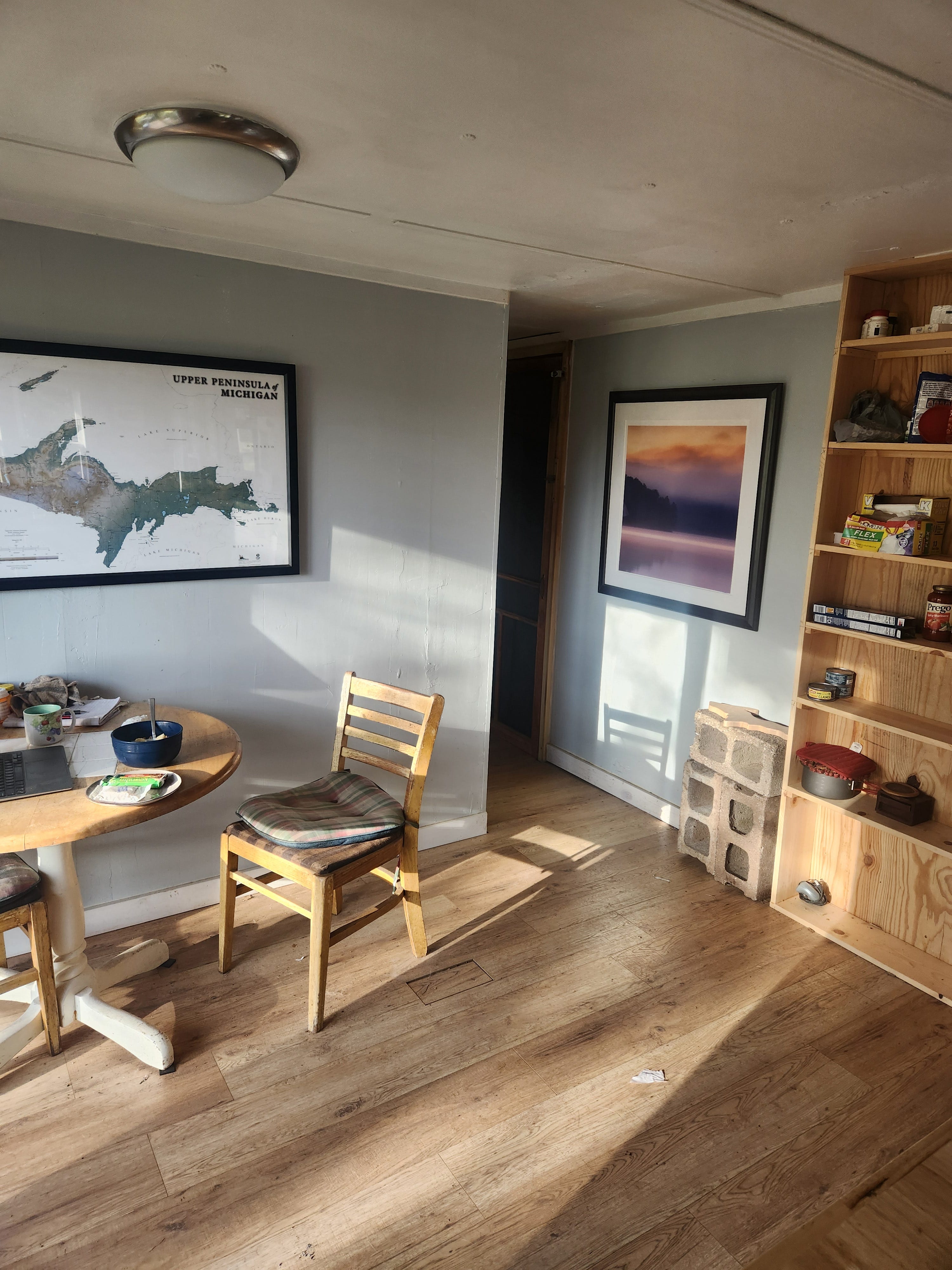 When i tore walls down last spring the electricity having been brought in the previous fall, the well powered up, ruptured waterlines repaired powering my life with more ease than the off-grid generator at the trailer perched on Lake Superior i commuted daily from and put in the sliding door and added flooring and a shelf for food i could for the first time envision the reality of a space where i could not only live comfortably and simply but take advantage of the natural world which had already been conjured from the streams where trout held shyly and fed aggressively and the people i felt an affinity for. To be accepted at a certain level of competence for being of a naturally independent, self-sustaining nature.