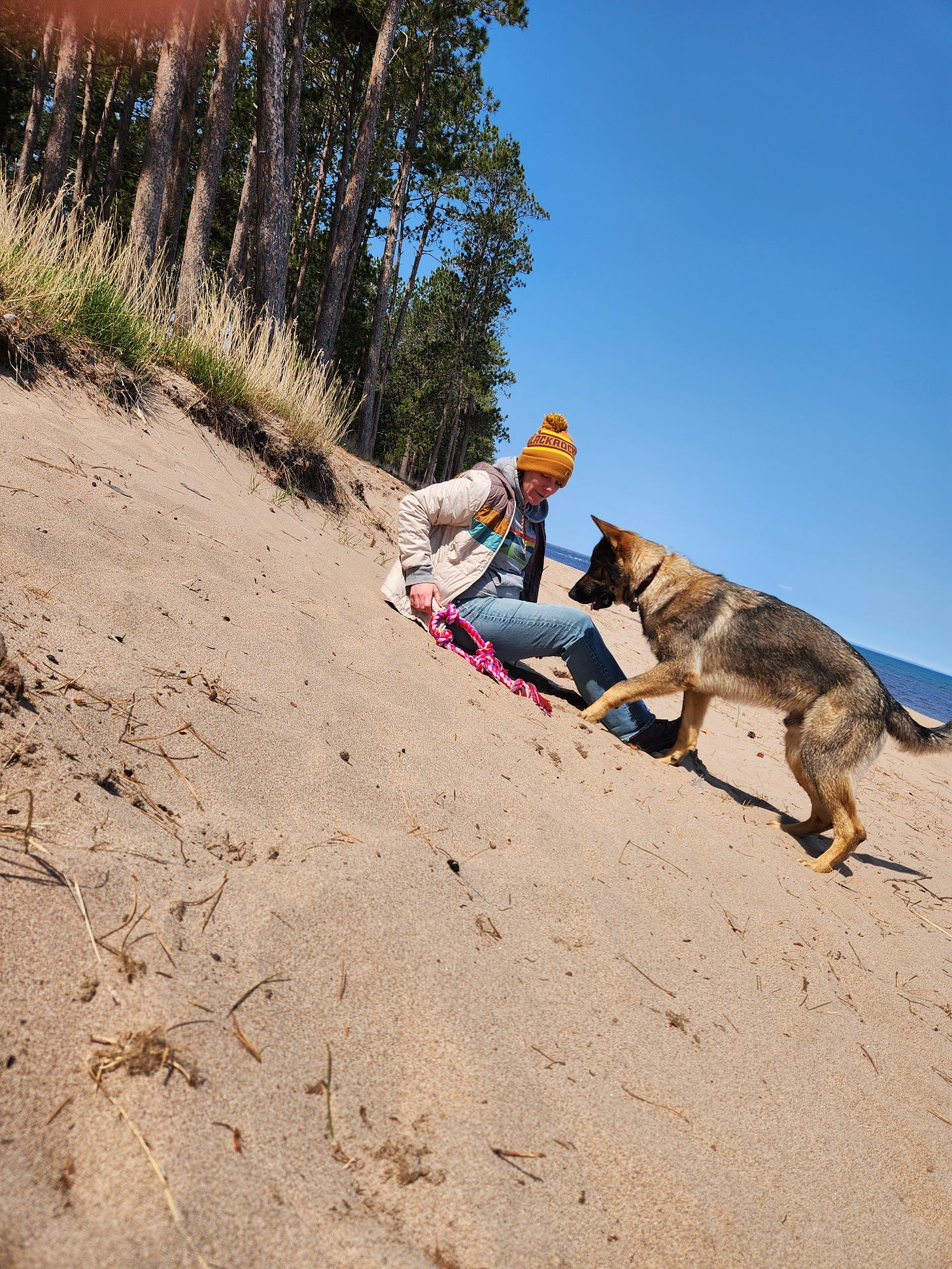 There have been two weeks of re-acclimating and Monday i finally met up with Kimmee from Marquette on the Huron beach overlooking the two islands, the tendril of the Keweenaw Peninsula extended ghostlike in distance out to its tip on far horizon and she was excited to see me and the dogs again and i to have her no-nonsense Wisconsin humor and common sense and anyways we had conversed over the winter enough not to be strangers.